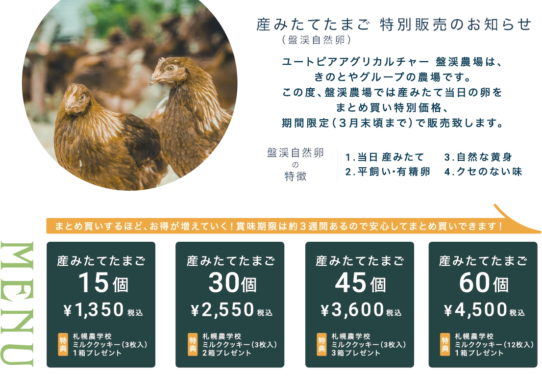 ユートピアアグリカルチャーの盤渓農場で育てた産みたて当日の卵を、3月末頃までの期間限定で、特別価格にて販売いたします。